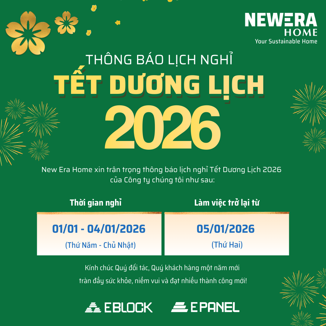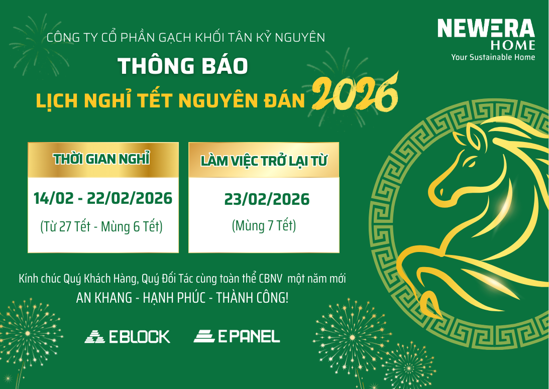 Để thuận tiện cho việc giao – nhận hàng, Công ty Cổ phần Gạch Khối Tân Kỷ Nguyên (New Era Home) xin thông báo LỊCH NGHỈ TẾT của Công ty chúng tôi như sau: